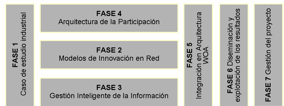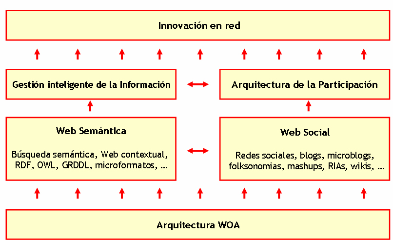En la figura se muestra cómo las tecnologías Web sociales y semánticas dan soporte a los dos retos principales de la innovación en red (gestión inteligente de la información y arquitectura de la participación). Finalmente cabe destacar que todos los desarrollos en torno a las tecnologías Web semánticas y sociales se integrarán en una plataforma basada en Internet siguiendo los principios de una arquitectura WOA (Web Oriented Architecture).